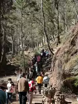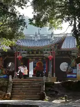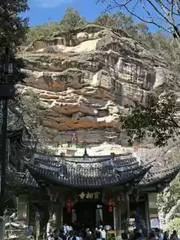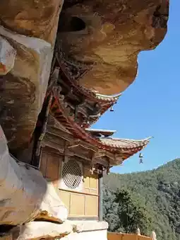 Baoxiang Temple is about 2 kilometers from the eastern entrance of the scenic area and can be reached by the scenic area's sightseeing bus. The sightseeing bus has two stops: Baoxiang Temple and Shizhongshan. The fare from the entrance to Baoxiang Temple is 5 yuan one way, and from Baoxiang Temple to Shizhongshan is 15 yuan one way; tickets can be purchased in segments or as a combination. ⛰️The main attractions of Baoxiang Temple are the pavilion buildings and inscriptions arranged along the cliff walls, as well as the relatively civilized troop of monkeys🐒. Off the sightseeing bus, there is a square with many snack stalls, where monkeys have already appeared, and there are vendors selling snacks to feed the monkeys. As you ascend the stairs, you'll encounter many monkeys🐵🐵🐵, which are more well-behaved and docile than those at Emei Mountain or Qianling Mountain. Upon reaching the temple gate, you can see the sheer cliffs behind, with two pavilions built between the cliffs, connected by a rainbow bridge, and a thin stream cascading down the cliff, staining the rocks with mottled colors. There are paths on both sides of the cliff that lead to the Jinding Temple at the mountain top; the right path is longer, passing by monks' graves, Tongming Pavilion, and Lingquan Hermitage, all built against the mountain rocks. Jinding Temple enshrines the local Bai people's patron deity, and many locals come here to draw divination lots and enjoy a communal feast.