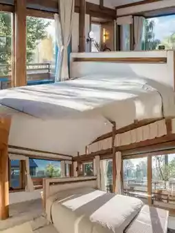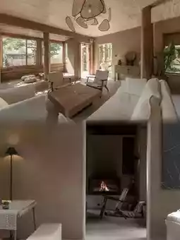 Warm hues, soft lighting, and natural wood and stone accents create a welcoming and relaxing ambiance in the guest rooms. Thoughtful touches include handmade tea sets, local teas and snacks, and a Marshall speaker for an immersive audio experience while you get ready.