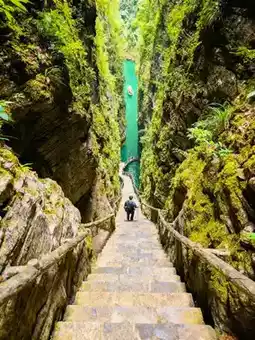 For a 1-day deep experience, start early: Enter before 9 a.m. and head straight to the photo spots, rent a boat with a boatman for 100 yuan to pose for photos; from 10 a.m. to 2 p.m., the sunlight makes the water most transparent, perfect for photos. Hike the plank road to check in at "Five-foot Gate" and "One Line Sky," then challenge the 1,988-step Gangbu Heavenly Ladder in the afternoon to overlook the entire canyon, a breathtaking sight.