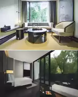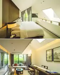 As the debut property of New Century's luxury resort brand "Fangwai," the hotel was designed by the China Academy of Art team. Embracing the philosophy of "a sanctuary beyond the mundane," it masterfully blends traditional Zen aesthetics with modern minimalism. Black-tiled, white-walled buildings cascade along mountain contours, their gray-white palette harmonizing with the natural landscape. Floor-to-ceiling windows frame picturesque views, while interplaying indoor-outdoor light reveals the profound artistry of Eastern negative space.