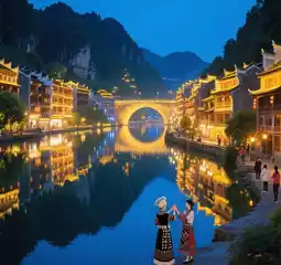 > **Zhenyuan Ancient Town:** Wuyang River’s S-curve nightscape rivals *Spirited Away*; rent Miao costumes for ethereal riverside photos.
