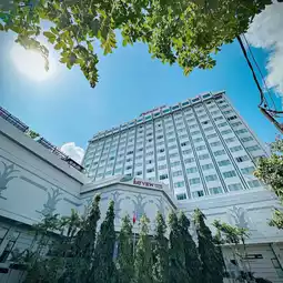 The colorful buildings surrounded by green trees under the blue sky and white clouds are very outstanding