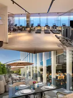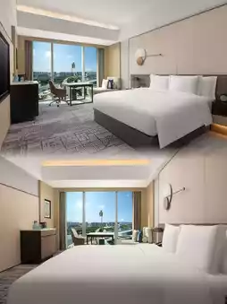 The 40-square-meter superior king room puts the shower room and toilet together, leaving enough space for the bathtub opposite the sink, and the wardrobe area is relatively compact. The 88-square-meter Crown Suite has a separate cloakroom, living room and bedroom. Because it is usually set at both ends of the building, the bedroom basically has a 270° view, and some suites can see the Binhai New District Sports Center not far downstairs.