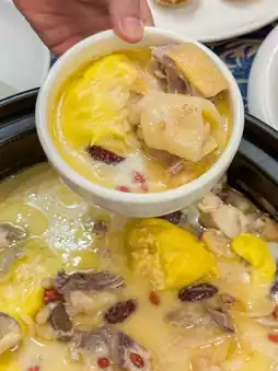 A huge pot! When the weather is cold, it's good to drink soup and eat chicken pot 🥰 Durian ➕ flower stalks are really nourishing! The durian pulp is sweet too! It is soft and glutinous when eaten after cooking!