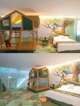 - Beyond thematic designs, rooms include quality bedding, private bathrooms, AC, and TVs. Some feature slides for extra fun. Thoughtful touches: kids' toiletries, slippers, picture books, and toys.