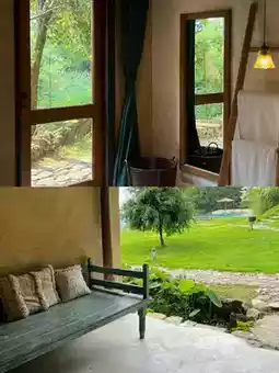 Spacious enough to roll around, with rammed earth walls and old wooden beams full of rustic charm 🌾, yet the amenities are anything but "rustic"—floor heating + dehumidifier effortlessly tackle the mountain humidity 💦~