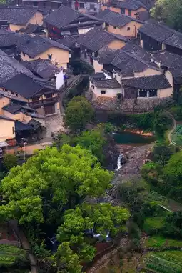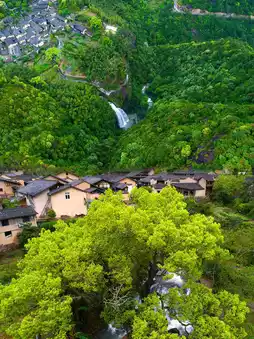 Zhejiang Lishui Longquan Xia Zhang Village. The mountain springs babble, the houses stand dignified, a waterfall hangs flying, resembling a scene from a Song Dynasty painting.