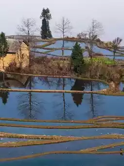 🌊Walk along the Aichunlan Rice Terraces and enjoy the beautiful scenery of the blue rice fields where the water and sky complement each other.