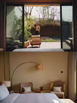The hotel's design looks like a "cheat sheet" of nature, with huge floor-to-ceiling windows in the lobby, and layers of greenery and waterfalls outside. The rooms are decorated in clear colors, with wood, stone, and some metal elements. Each room is like a "picture frame," with a different view outside the window: some have views of waterfalls, some have views of distant mountains, and some have private terraces where you can take a bath and get close to nature. Some rooms even have private gardens where you can relax in your own pool.