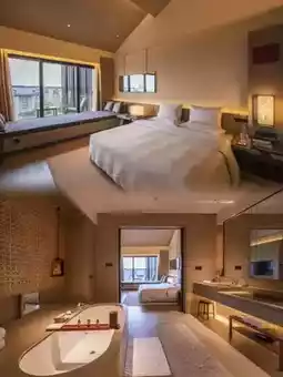 The 200 contemporary Jiangnan-style rooms are built around the Liangting. The rooms range from 60 to 130 square meters, with 7 types of rooms and a ceiling height of 4 meters, giving a great sense of space. The rooms are decorated in a quiet and elegant wood tone, with a bright and open layout and a cleverly arranged living area. The rooms are equipped with underfloor heating and air conditioning, electric curtains, Bluetooth speakers, smart toilets, Thai iPlusQ products, New Zealand GRIN toothbrushes and toothpaste, organic rose tea, Villeroy & Boch cups, and King Koil mattresses.