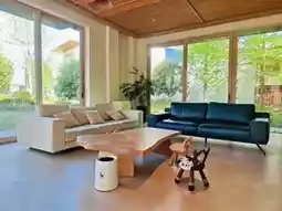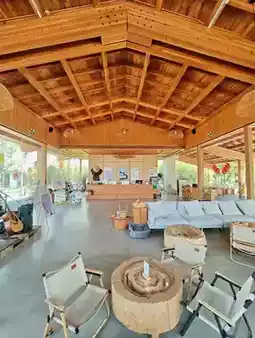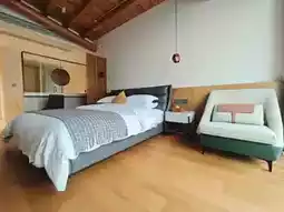 Twelve uniquely designed villas dot the lakeshore like pearls. The communal area boasts a spacious living room with floor-to-ceiling windows, a cozy fireplace, and wooden bookshelves. Imagine spending an evening with friends, sipping hot tea on the plush sofas—pure bliss! Each room features a private balcony with stunning lake views, premium latex mattresses comparable to those in five-star hotels, and high-end bathroom fixtures. The attention to detail is remarkable, from the smooth texture of the wooden furniture to the elegant reed lamps by the bedside and the stylish sofas.