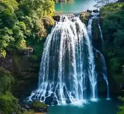 Before even getting close, the majestic roar of the waterfall echoes like a battle drum, urging visitors to quicken their pace. The waterfall plunges down from a hundred-meter cliff, resembling a suspended silver river. The splashing water droplets, like scattered jade, shimmer under the sun's gentle caress, transforming into a dazzling rainbow, dreamlike and enchanting.