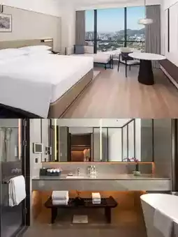 - Room Amenities: The hotel offers 261 rooms and suites, combining Marriott's modern design aesthetics with Chaoshan cultural elements. The spacious and bright rooms feature floor-to-ceiling windows, with some rooms offering views of the Rongjiang River and city landscape. The bedding is soft and comfortable, with down-filled pillows ensuring a good night's sleep, and hypoallergenic alternatives thoughtfully provided. Bathrooms include comfortable bathtubs and feature bath amenities from the renowned British skincare brand thisworks.