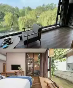2Huge floor-to-ceiling windows, lying down to view the unobstructed lake scenery. The lush green reflections on the water, and occasionally a few boats passing by on the lake, sitting in front of the window, drinking tea, and slowly feeling the passage of time