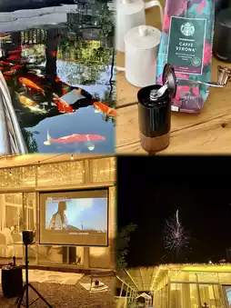 At 5 a.m., the bright sunrise rises from the foot of the mountain, and the beautiful scenery outside the tent is breathtaking. The koi in the pond swim freely under the sunlight.