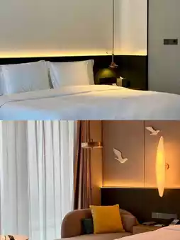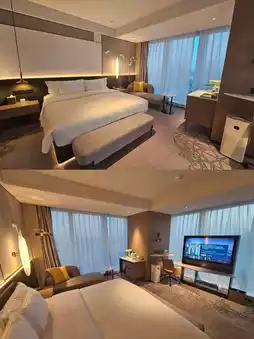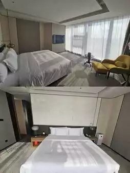 Room environment: The rooms are spacious, well laid out, and decorated in a modern and simple style. The rooms have floor-to-ceiling windows with electric curtains, offering city views. The headboard wall is designed with white relief and modern streamlined chandeliers, enhancing the overall taste.