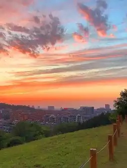 Climbing to the mountainside, the view suddenly opens up. On one side are rolling green hills with trees scattered in an orderly manner. The scenery changes with the seasons. In spring, the new green leaves and blooming mountain flowers complement each other, creating a vibrant scene; in summer, the green trees are shady, making it an ideal place to escape the summer heat; in autumn, the maple leaves are as red as fire and the ginkgo trees are golden, dyeing the mountains and forests into a colorful painting; in winter, the mountains are covered with snow, giving them a unique tranquil beauty. On the other side is a bustling city scene with high-rise buildings standing side by side and traffic flowing endlessly. The hustle and bustle of the city and the tranquility of the mountains and forests form a sharp contrast here, yet they are wonderfully integrated together.