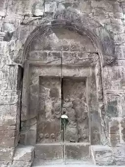 The pagoda body has arched doors on all four sides, with only the south side being a real door allowing entry into the pagoda chamber (an interior space of 2.2 meters square with a coffered ceiling); the east, west, and north sides have half-covered false doors carved with figures leaning in, lion heads, flying apsaras, musicians, and other patterns in the flourishing Tang style.