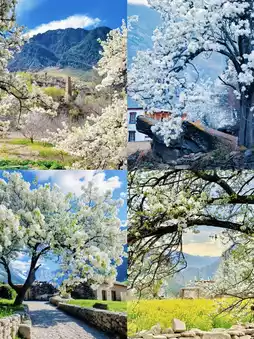 Ka'er Township: Savor a cup of butter tea under the shade of 300-year-old pear trees, immersing yourself in the tranquility of time. As the gentle breeze rustles through the branches, pear petals fall like a delicate rain, dusting the ancient prayer wheels, creating a captivating scene.