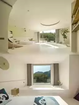 The homestay is hidden in the Moon Bay Scenic Area on the Sichuan-Tibet Line in southern Anhui, surrounded by green mountains and bamboo forests. The pure white building looks like a dreamy castle under the starry night, complementing the surrounding natural beauty. The courtyard is exquisitely decorated, and the pool is clear and blue. Every corner shows the ingenuity of the scenery, making you feel like you are in a resort in Bali.