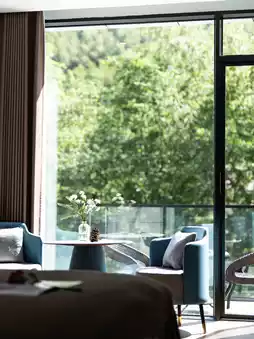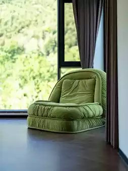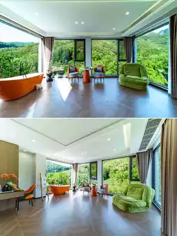 The homestay has a total of 15 guest rooms, and the floor-to-ceiling windows offer a panoramic view of the greenery of Shuimo Tingxi. In the afternoon, lie on the sofa by the window, watch the light and shadows dance waltz on the stream, and open the window to hear the concerto played by the stream.