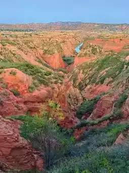 🌟Red Cliff Danxia: This is a typical canyon landscape in the Wave Valley Scenic Area. The north side of the canyon is a nearly 100-meter-high red rock cliff, while the south side is a typical Loess Plateau landform. Walking in between, the two completely different views bring a strong visual impact, and there is a strange beauty in contrast. The bottom of the valley is full of green grass, the Liusha River shuttles through it, and there are several natural "echo walls". Among them, there is a curved turn. Chatting tens of meters away, you can't see the person, but the voice is close to your ears, which is wonderful.