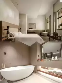 The hotel is designed by the famous domestic architect Dong Gong. Based on industrial heritage and era memory, it integrates modern design concepts and creates an artistic space. The camphor forest in the center of the hotel is carefully protected, and the wooden corridor surrounds it, forming a round layout, connecting guest rooms, banquet halls, tea rooms and front hall restaurants. Every detail embodies the concept of harmonious coexistence between man and nature.