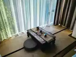 The Japanese tatami room also comes with a small tea table with local tea sets and large floor-to-ceiling glass windows. The afternoon sun shines into the tea room, and the green trees can be seen when the curtains are opened.