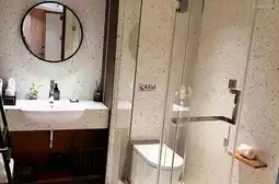 The bedroom is truly stunning. With its spacious layout, the wooden floors and ceiling beams complement each other beautifully. The soft and cozy bed feels like a warm embrace from Jiangnan itself. The highlight is the open-concept bathroom, featuring terrazzo textures that are both high-end and unique. The round mirror and elegant vanity add a touch of luxury to every detail.