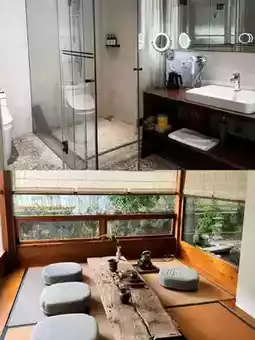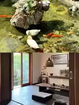 🌱The guesthouse has its own courtyard 🏡 with a great atmosphere, featuring a babbling brook, ducks 🦆, and koi fish. It’s perfect for taking photos. The public area also includes a tea house and free tea leaves 🆓.