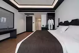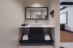 The homestay offers five room types: Modern Wind King Room, Elegant Bathtub King Room, Giant Screen King Room, Serene King Room, and Family King Room or Twin Room. These options cater to couples, ceramic art learners, and business travelers. The bathrooms feature dry and wet separation with golden accents for a touch of elegance. The shower and toilet areas are separated for convenience.