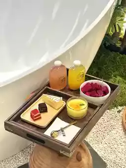 A room surrounded by greenery with a bathtub amidst tropical vegetation, full of vitality 🍂.