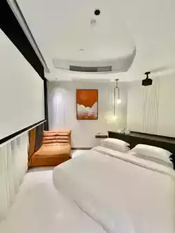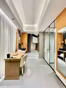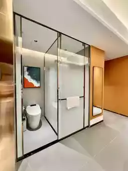 The facilities and equipment in the room are all intelligently controlled. There is a projector so you can watch movies and listen to music before going to bed. There is also a separate bathroom and balcony. The bathroom is separated into dry and wet areas, and the smart toilet is thoughtfully equipped with disposable cushions, which is clean and hygienic.