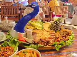 The Peacock Feast is a unique Dai food feast. It is shaped like a peacock with its tail spread out🦚. The dishes are rich and varied, including roasted pork belly🥩, roasted chicken🐔, grilled fish with lemongrass🐟, pineapple rice🍍, pilaf, etc., served with secret seasonings and various special wild vegetables!