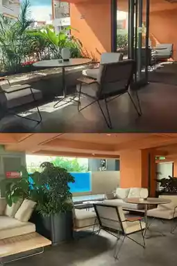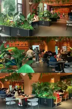 This hotel is full of artistic design, from the name to the rooms and restaurant. The brown leather sofa, brass metal installations, and cement gray are very high-end, and the green plants make the space full of life.