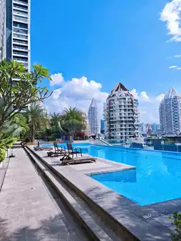 After putting on your swimsuit, you can go for a swim in the outdoor swimming pool upstairs🏊♀️