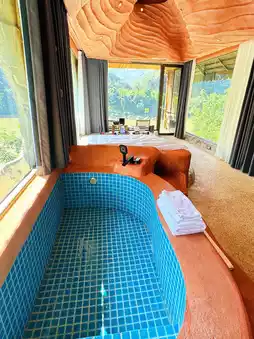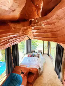 The interior structure of the room is unique, as if living in the "Spider Cave" of "Zixia Fairy"! With floor-to-ceiling windows on three sides, the room has its own balcony, offering a panoramic view of the Mekong River, which is breathtakingly beautiful. The room is fully intelligent and can be controlled by voice! All drinks in the fridge are free!