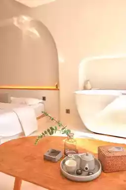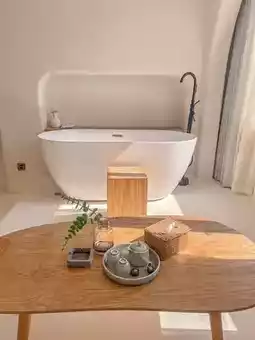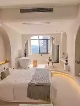 🛁 The room is decorated in a simple white style and has a white bathtub