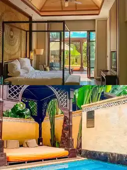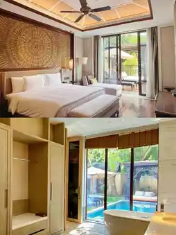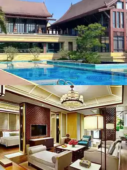 The hotel is located at the foot of the picturesque Ji Mountain, surrounded by lush tropical plants and clear streams. You can take great photos at this hotel, and it has a private infinity pool, floating afternoon tea, a Buddhist hall, an outdoor pool, and other facilities.