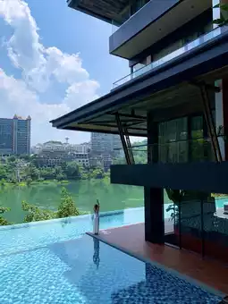If you love upscale hotels with dark color schemes, you must stay at Shi'er Lan. Located along a prime riverside view, it features an enormous infinity pool. The furniture and decor have a distinctive style that shows real attention to detail.