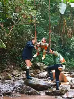 The whole route is about 6 kilometers, walking and playing along the way, not tiring at all. Led by local Jino people and a science teacher, we caught crabs 🦀, stepped in water puddles, observed chameleons, swung on swings, ate sour ants, learned wilderness survival skills from the guide, recognized hemostatic herbs 🌿, blew bamboo, ate wild fruits, used stones to grind colorful mud for sunscreen, and enjoyed a rainforest feast.
