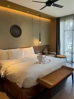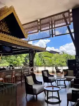 • Noon: Check in; the room is spacious and comfortable, with a private viewing balcony. Open the window to see the tropical garden view! 🌺 I chose the Prestige Deluxe Room, featuring Dai-style rattan furniture and ethnic-style cushions that create a strong exotic atmosphere—love it~ 💕