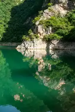 The north bank features towering cliffs adorned with Huashan pines, while the south bank boasts a rich variety of native trees, giving it the feel of a primeval forest.