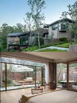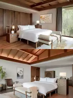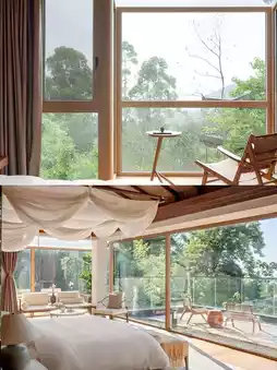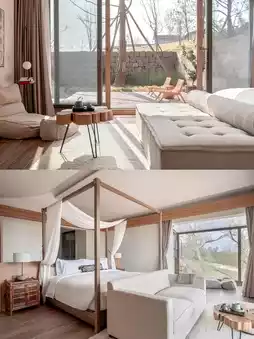 The rooms here are uniquely designed, with large floor-to-ceiling windows offering an unobstructed view of the endless scenery. The interior design combines modern luxury with natural elements, and lying on the soft bed feels like being in the clouds, sleeping with the stars.