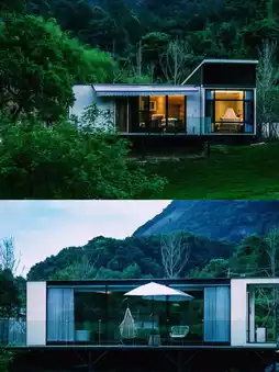 Glass cabins perch on the cliffs, the creek beneath the stone bridge is lined with rocks, and children's hand-painted kites add charm...
