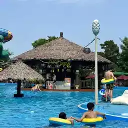 Evenings here are magical! Relax by the pool and gaze at the sea as the sun paints the sky in shades of pink and orange. The shimmering sea surface paired with a music festival vibe makes every photo look like a masterpiece. The park also has tons of Instagram-worthy spots, like Greek-style white walls and Hobbit houses, perfect for snapping pics that will have everyone asking where you are!
