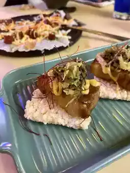 Five-spice pork loin with pot sticks: Crispy and delicious rice-flavored crispy pot sticks topped with fatty five-spice pork loin, full of lard, a very wicked snack, plus plenty of pickled melon and thousand island sauce to reduce the greasiness.