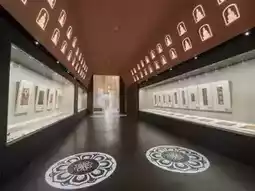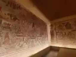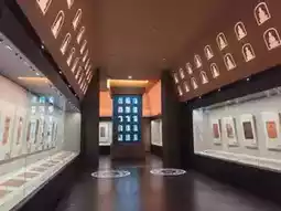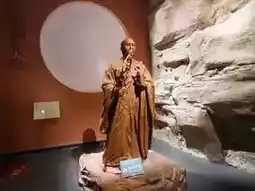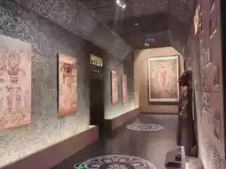 The 'Treasure of the Stone Chamber' cave art exhibition at the Jiuquan Museum is divided into three parts: 'Cultural Integration', 'Carving Cliffs and Opening Caves', and 'Dunhuang Jewels'. It mainly displays the wisdom and skills of ancient artists through a combination of replicas of colored sculptures, murals, illustrations, and physical exhibits. Many classic replicas are on display, such as the Bodhisattva attendant in Cave 45 of the Mogao Grottoes, the Sakyamuni meditation Buddha statue in Cave 259, as well as the Sakyamuni Preaching Under the Tree painting (now in the British Museum), the Water Moon Guanyin statue (now in the Musée Guimet, France), and the Fuxi and Nüwa (now in the National Museum of India), among others.