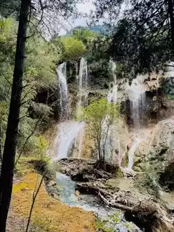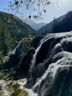 The waterfall takes its name from the Pearl Shoal (Zhenzhu Tan), a wide, gently sloping travertine-covered plateau.