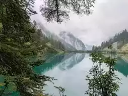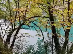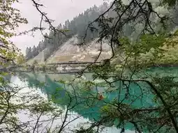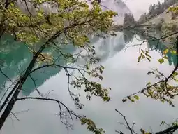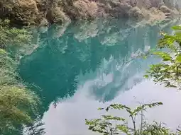 The beauty of Jianzhu Lake changes with your perspective. Look across the valley to see a dramatic scene where the misty mountains and their reflections merge into a vast painted scroll. By the shore, through a frame of green bamboo and leaves, the view becomes quiet and intimate. The water shines in jewel-like blues and greens, revealing even the sunken calcified logs and creating a detailed, picturesque scene.